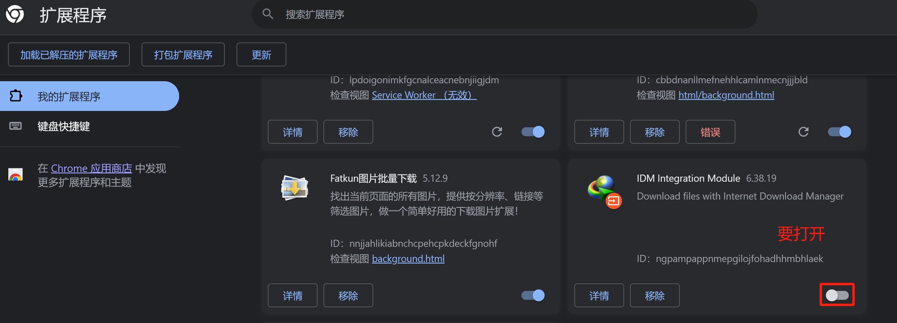 7、打开“扩展程序”,将插件打开,默认是关闭的