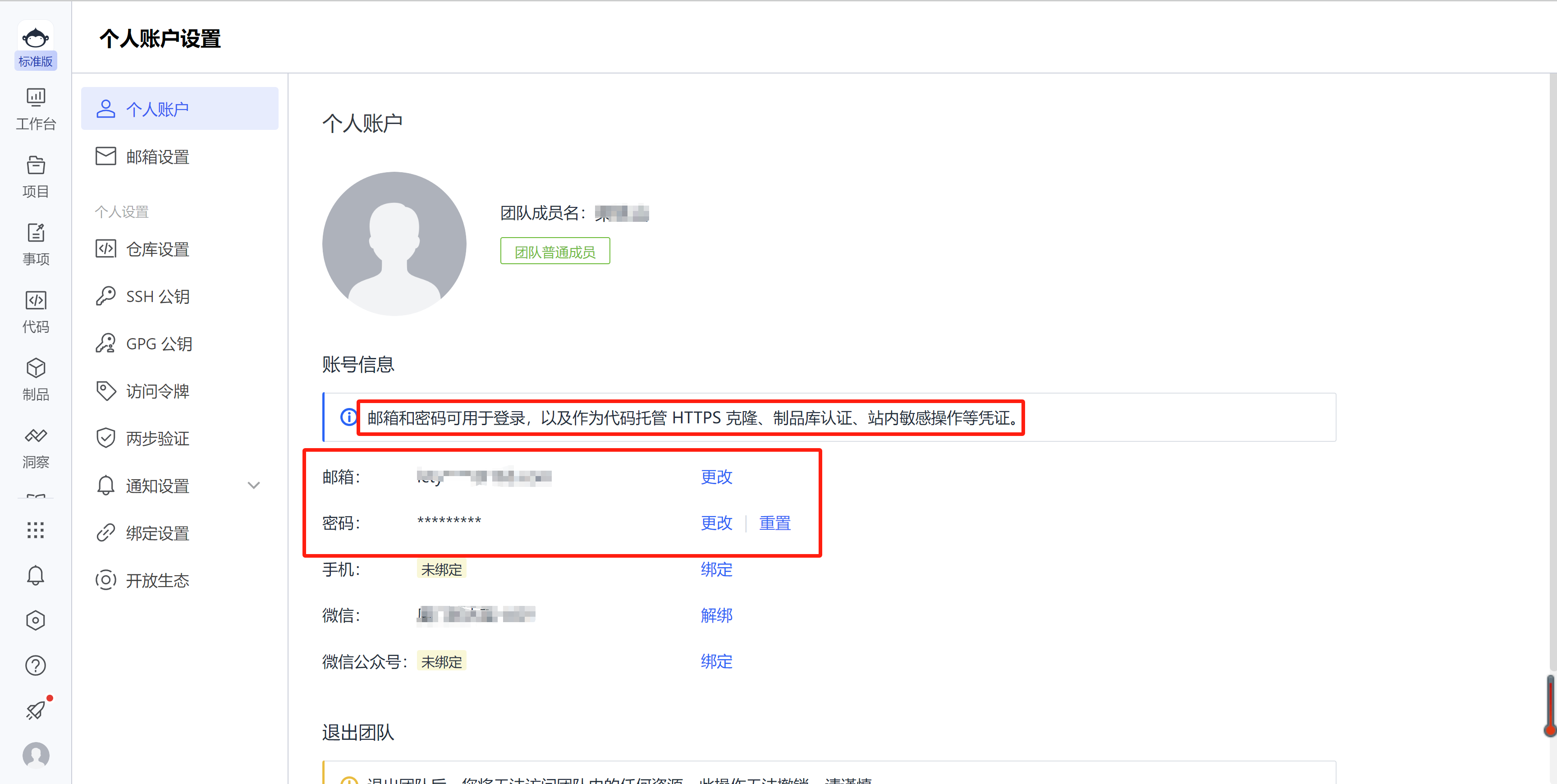 2、这里的 邮箱和密码可用于登录,以及作为代码托管 HTTPS 克隆、制品库认证、站内敏感操作等凭证。