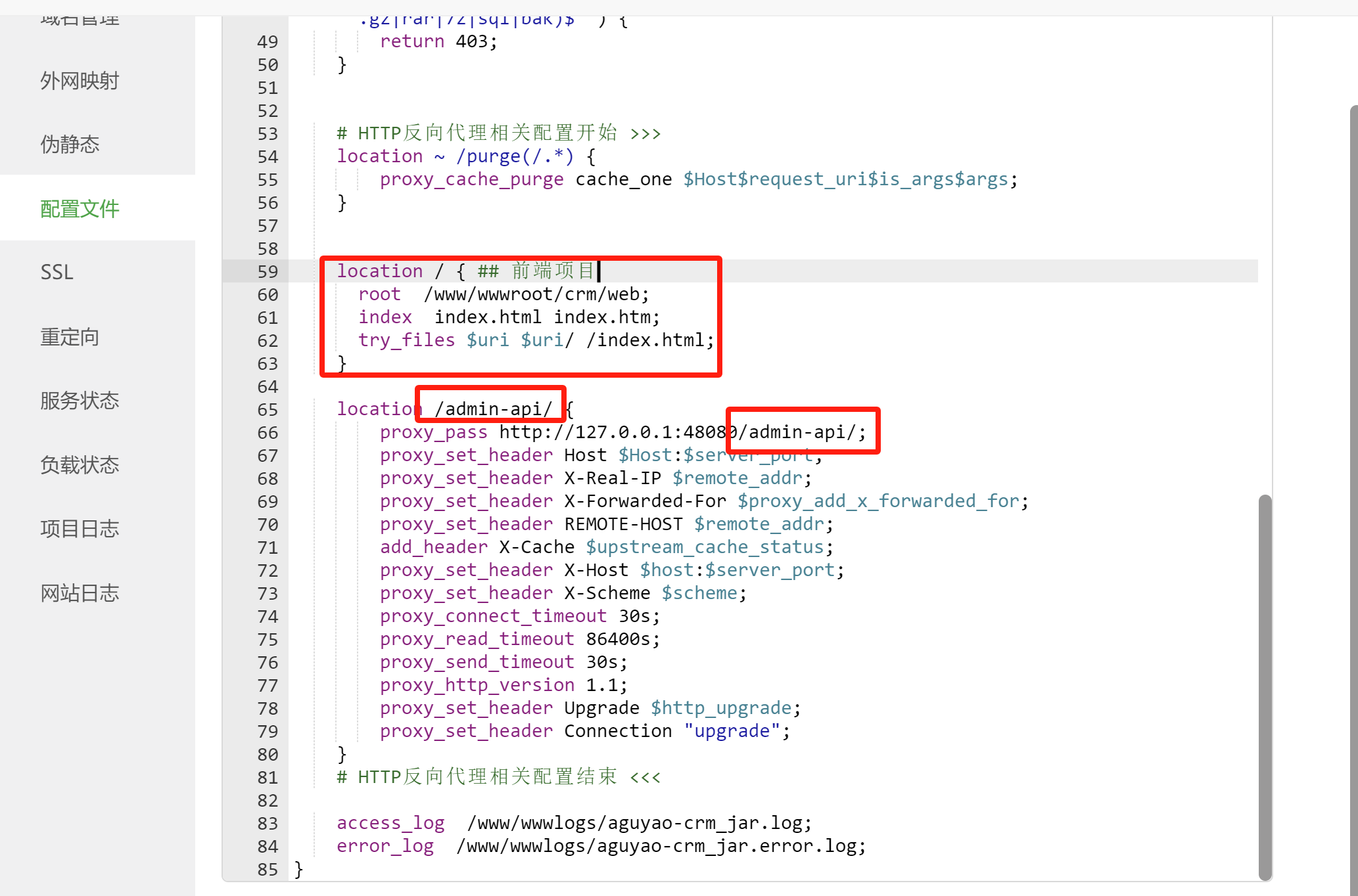 5)nginx代理,这几个地方要特别注意。包含admin-api都会被代理,并且这里的admin-api是后台需要的,所以在proxy_pass后面需要再次配置/admin-api/。否则,不需要。